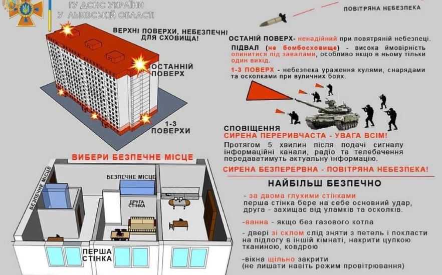 Правило «двох стін». Від небезпеки вас має відділяти щонайменше 2 стіни, бо одна, ймовірно, зруйнується від удару, а друга візьме на себе уламки стіни, віконного скла тощо. Тому ховатися безпечно у місці, яке розташоване за другою від фасаду опорною стіною. Зазвичай це тамбур, коридор або передпокій. Навіть, якщо вам здається, що будинок нестійкий, підвалу нема, а в сховищі нема місця, лишайтеся біля опірних стін – вони витримають.