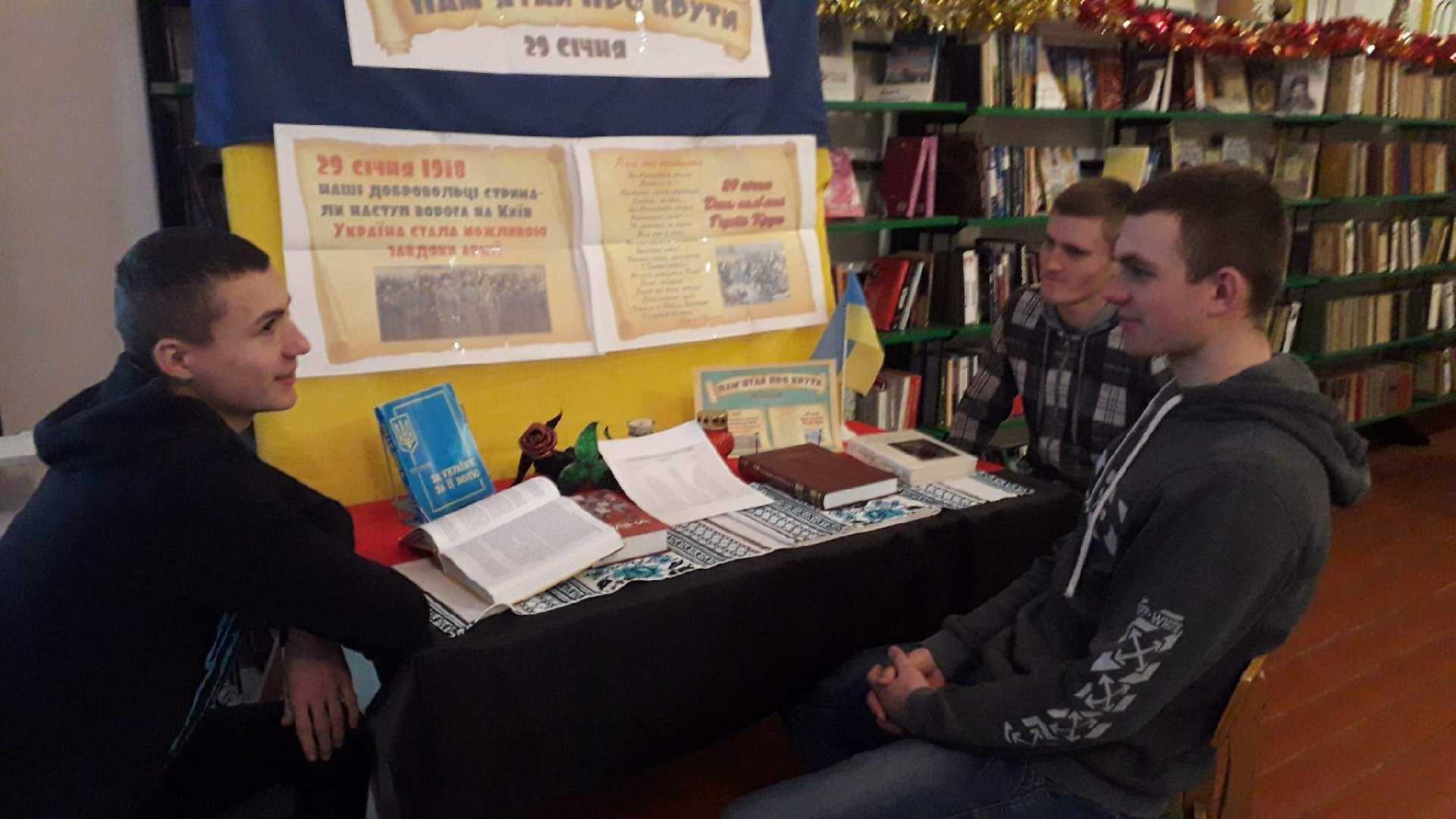 В Народних домах та публічних бібліотеках району проведено інформаційно-історичні години "Крути - наша слава, наша історія". В межах заходів декламували вірші, ознайомилися з тематичною виставкою книг "Крути - героїчна сторінка історії". В бібліотеках провели читання, переглянули фільми "Крути 1918", "Герої України. Крути. Перша Незалежність", "Україна: забута історія. Крути: молода кров". До вшанування 105 річниці пам’яті загиблих Героїв Крут долучились учні та вчителі учбових закладів району, провівши акцію у соціальній мережі Facebook, де декламували вірші та співали пісні на патріотичну тематику.