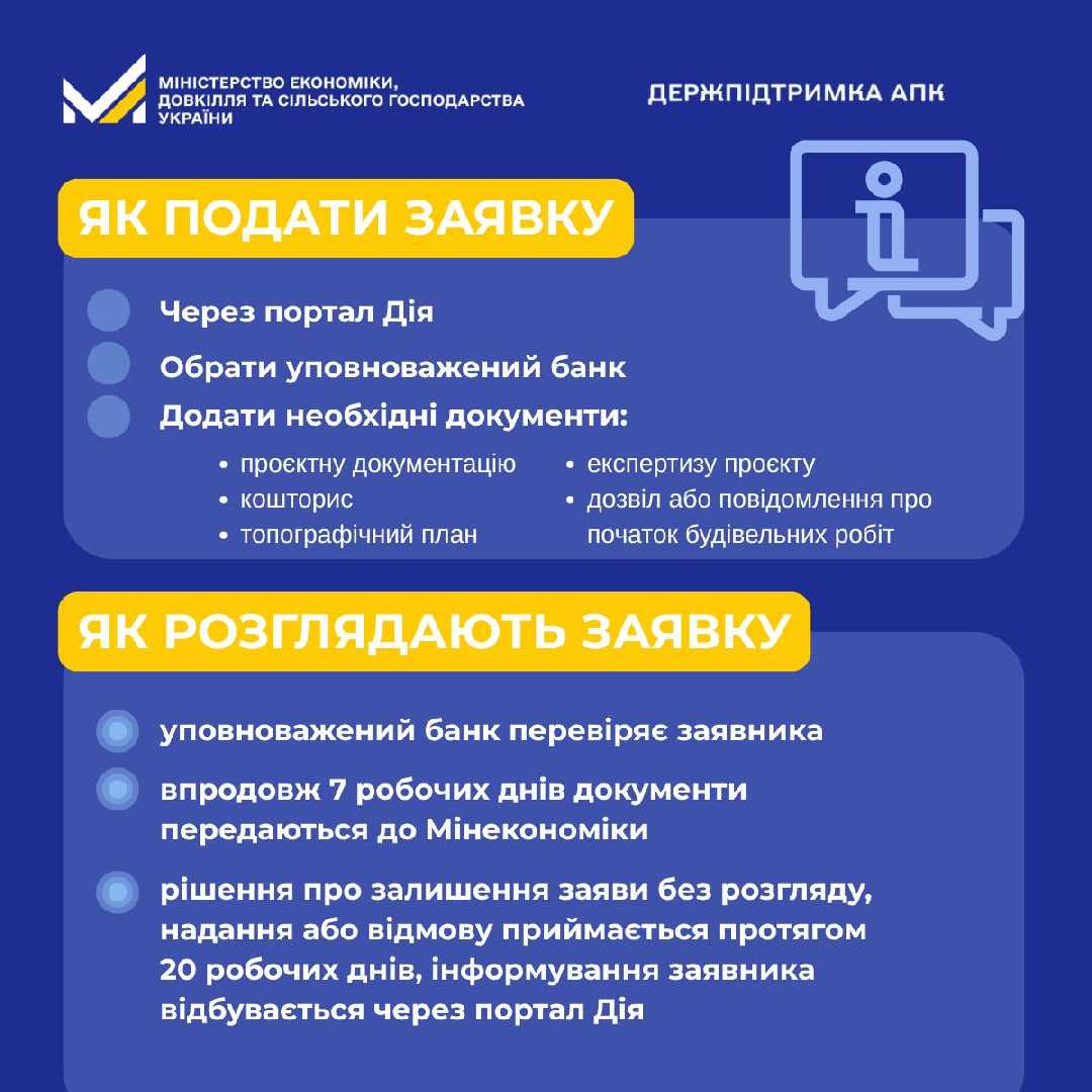Подання заявок здійснюється через портал Дія із обов’язковим додаванням проєктної документації, кошторису та дозвільних документів на виконання будівельних робіт.