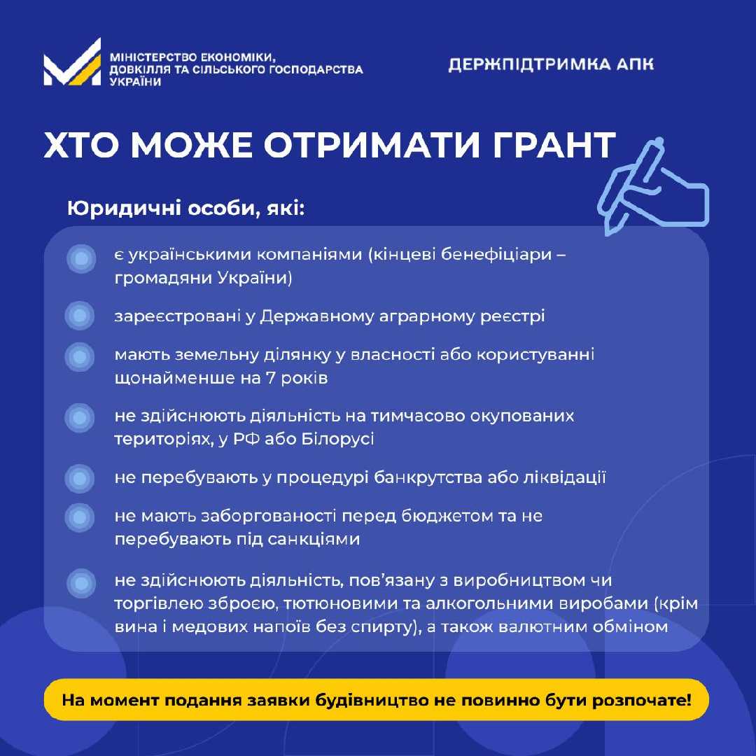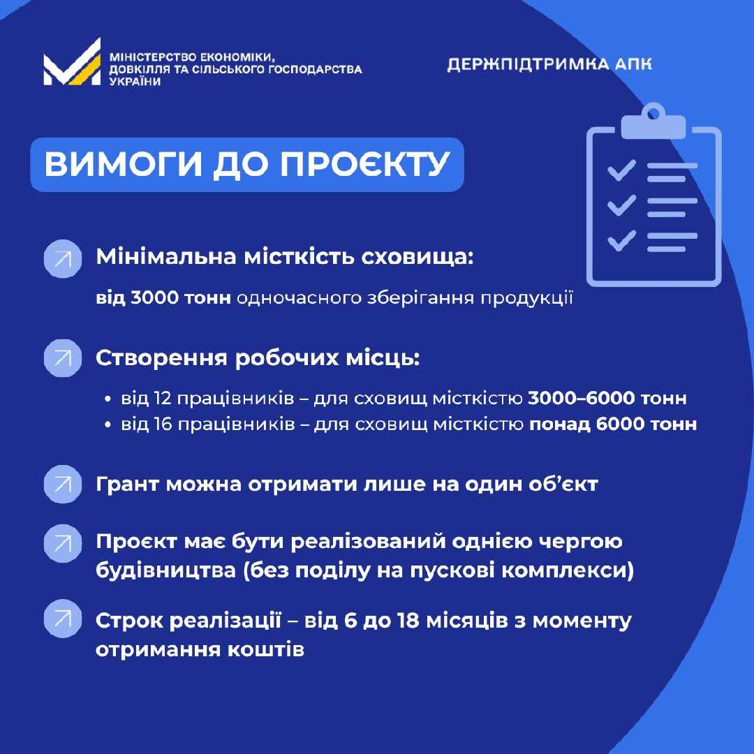 Грантова допомога надається для зведення сховищ місткістю від 3 тисяч тонн із обов’язковою умовою створення нових робочих місць. Зокрема, для об’єктів місткістю від 3 до 6 тисяч тонн передбачено працевлаштування не менше 12 постійних працівників, а для сховищ понад 6 тисяч тонн — не менше 16 осіб.