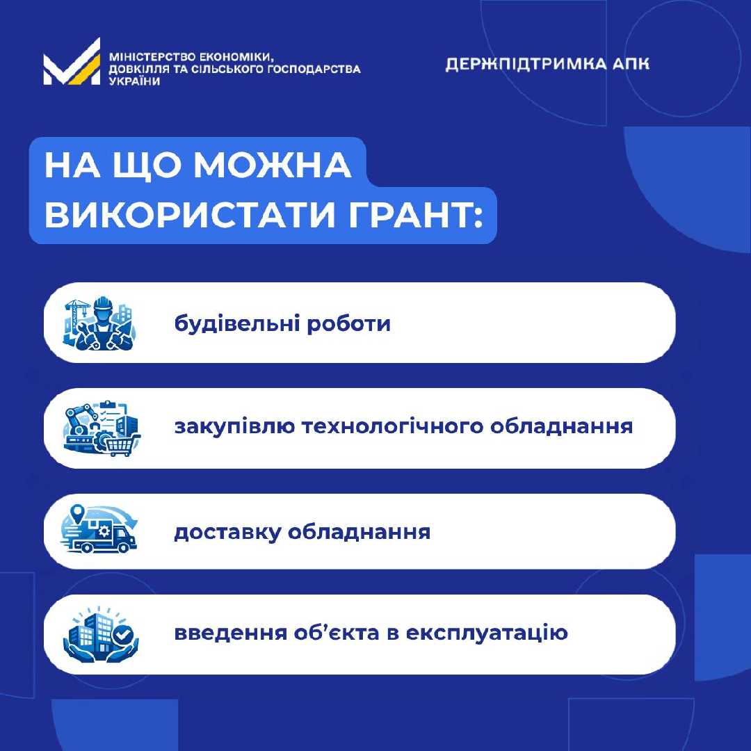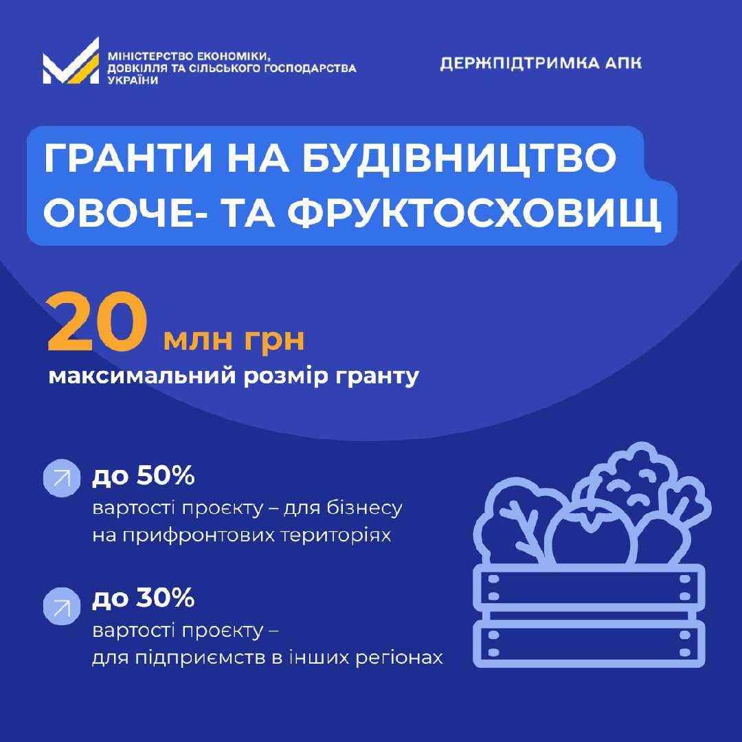 Програма передбачає надання грантів на будівництво сучасних овочесховищ і фруктосховищ, на реалізацію яких у поточному році виділено 220 мільйонів гривень.